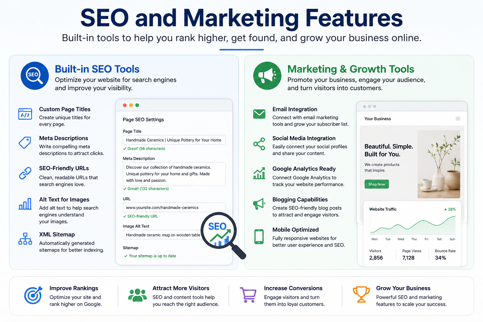 Mozello includes basic SEO features to help your website rank on search engines. You can edit meta tags, URLs, and descriptions to improve visibility.